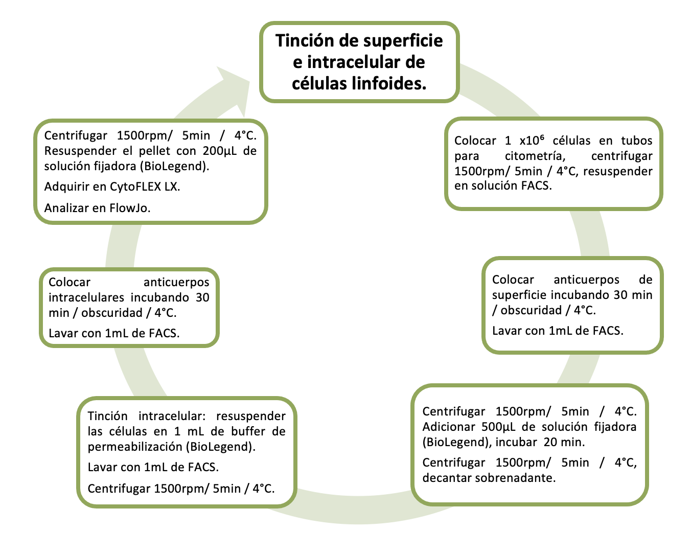 Tinción intracelular Realizar tinción de superficie. Re-suspender las células en 1mL de buffer de permeabilización (BioLegend). Incubar 5 minutos / 4ºC. Lavar con 1mL de buffer de permeabilización (BioLegend). Centrifugar 1500rpm / 5 minutos / 4°C. Colocar anticuerpos intracelulares titulados. Incubar 30 minutos / obscuridad / 4ºC. Lavar con 1mL de buffer de permeabilización (BioLegend). Centrifugar 1500rpm / 5 minutos / 4°C. Re-suspender el pellet en 200µL de solución FACS. Analizar la muestra inmediatamente o en los 2 días posteriores a la tinción. Conservar la muestra hasta realizar el análisis.