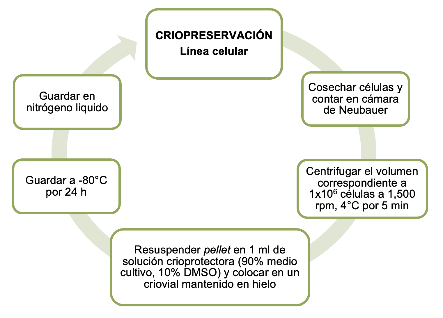 - Partir de un cultivo celular subconfluente al ~80-90% Cosechar las células, pasar a tubo Falcon de 15 ml y centrifugar a 1,500 rpm a 4°C por 5 min Decantar el sobrenadante y resuspender el pellet en 10 ml de medio de cultivo óptimo para la línea celular en cuestión Contar células en cámara de Neubauer (hemocitómetro) utilizando tinción con azul de tripano Por cada criovial que se desee: colocar en un tubo Falcon de 15 ml la cantidad de suspensión celular que contenga 1x106 células y centrifugar a 1, 500 rpm a 4°C por 5 min Decantar el sobrenadante, resuspender el pellet en 1 ml de solución crioprotectora (90% medio de cultivo, 10% DMSO) y pasar a criovial (mantenido en hielo) adecuadamente rotulado con el nombre de la línea celular, número de pase, densidad celular, fecha y nombre Guardar en ultracongelación (-80°C) por 24 h en gradilla de unicel y posteriormente almacenar en el rack correspondiente (#2) en el tanque de nitrógeno líquido.
